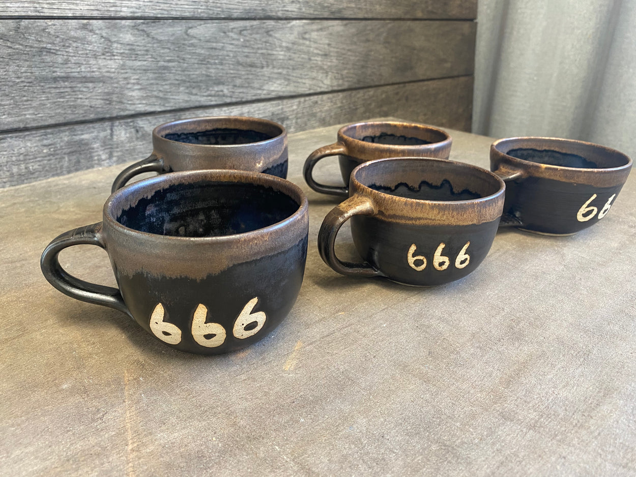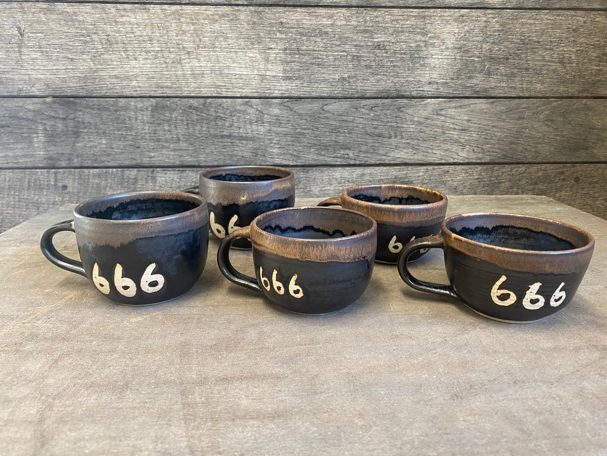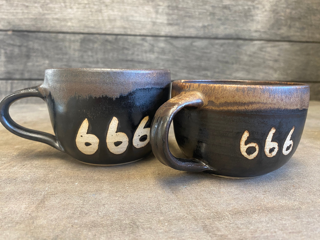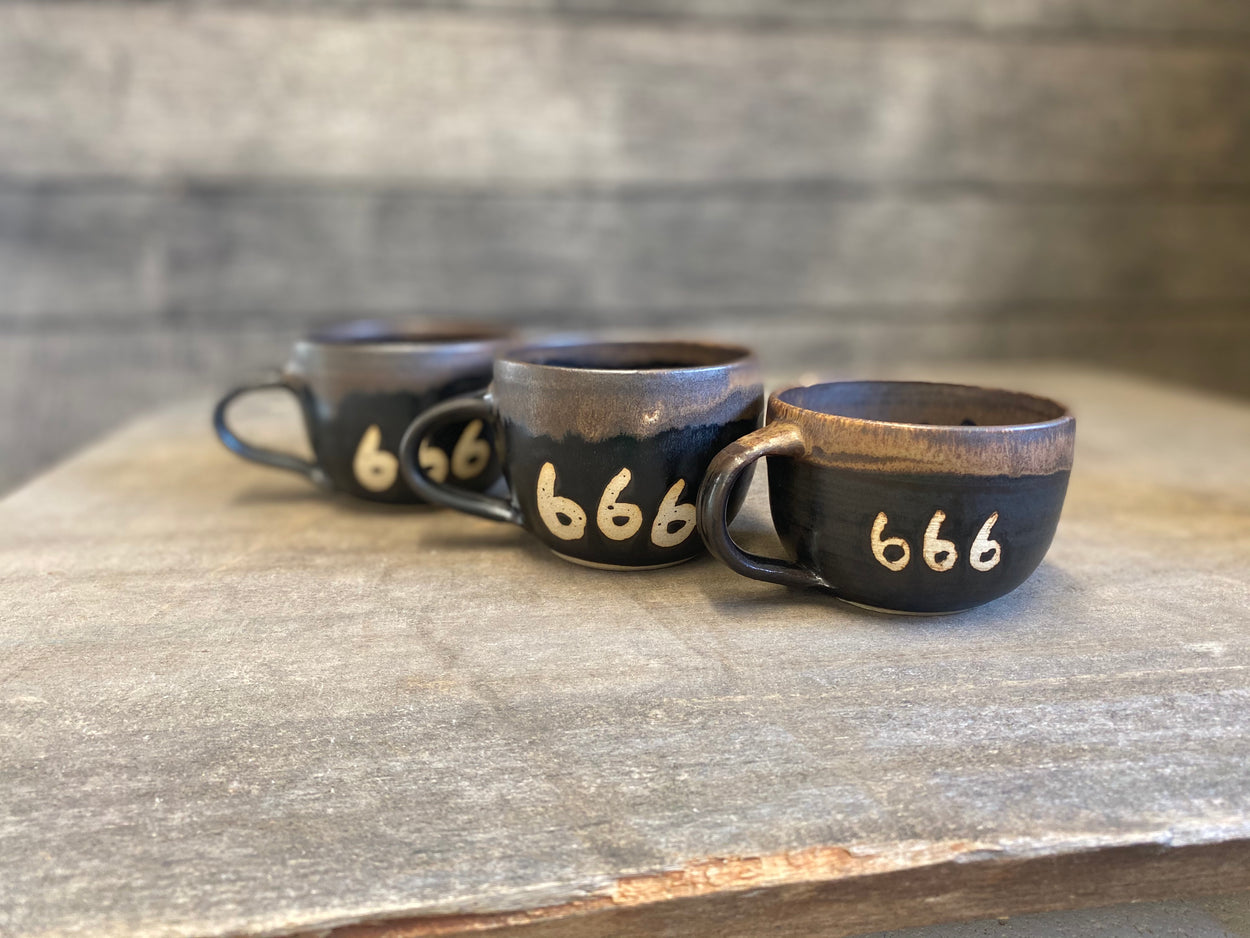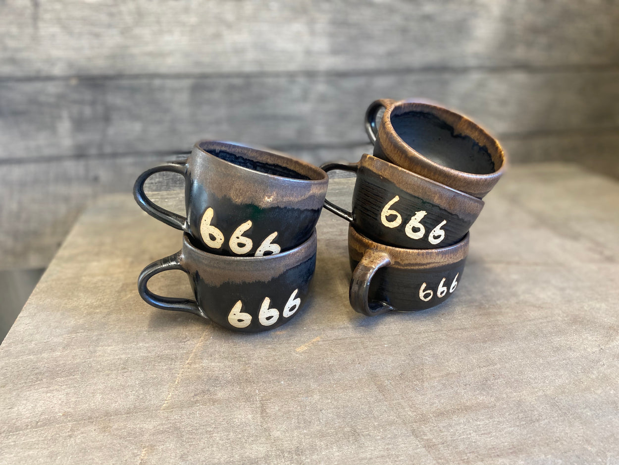 Who doesn't enjoy a little death metal with their morning coffee? If this sounds like you, then this is the cup you need. Wheel thrown stoneware with double glaze finish means these will hold up to the darkest of coffee and the eternal fiery temperatures of the dishwasher. Make your black coffee a little bit blacker.