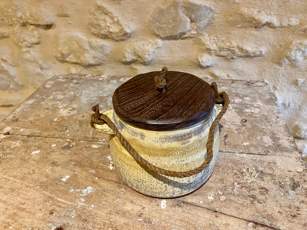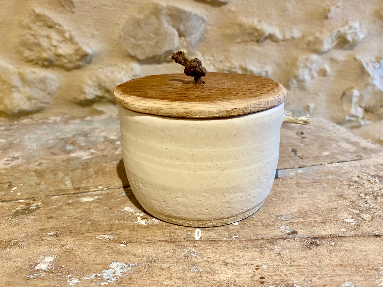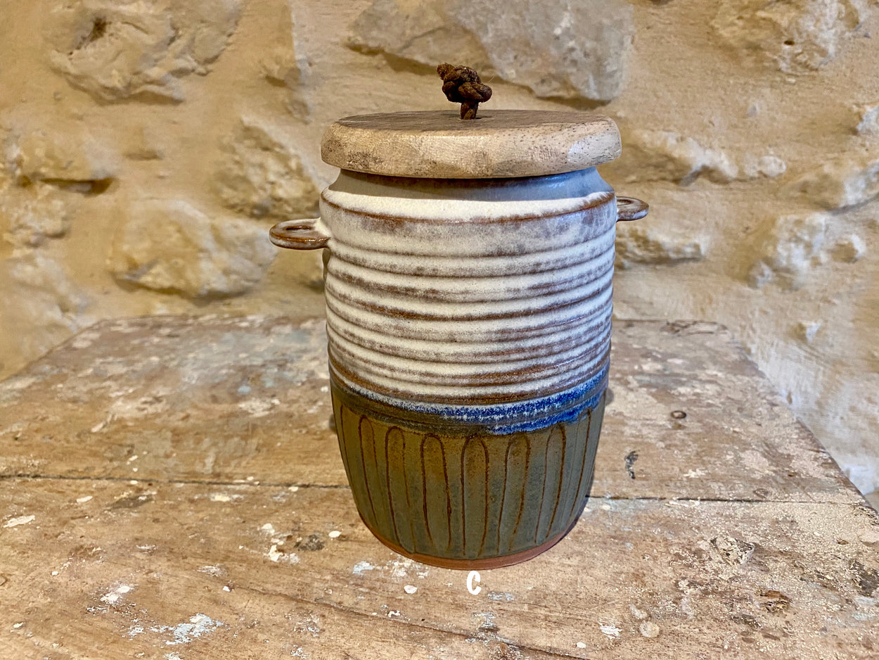 Lids are a great way to use up the smaller pieces of wood hanging around my workshop and make a great addition to some pieces such as these. Wheel thrown stoneware with a multi glaze finish, these will look right at home in any kitchen or on the shelf. The brown oak is the same wood used to make the lid and spoons for the sugar pots and is reclaimed from a thrown out dining table found on the streets of Paris.