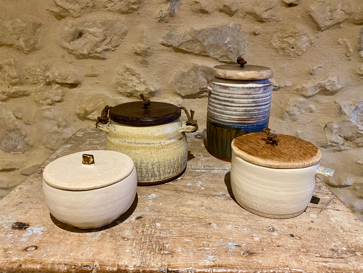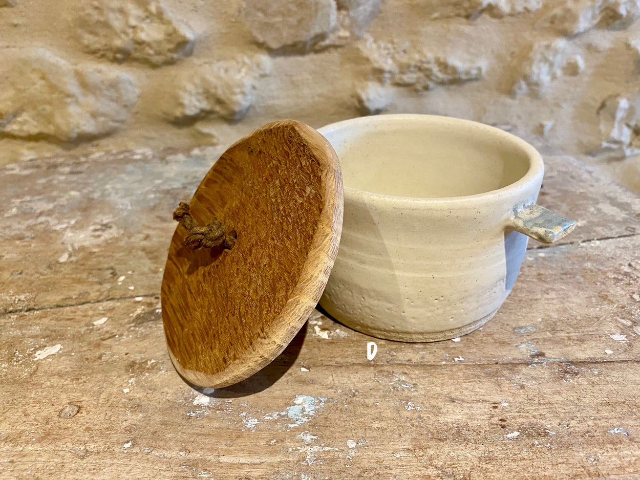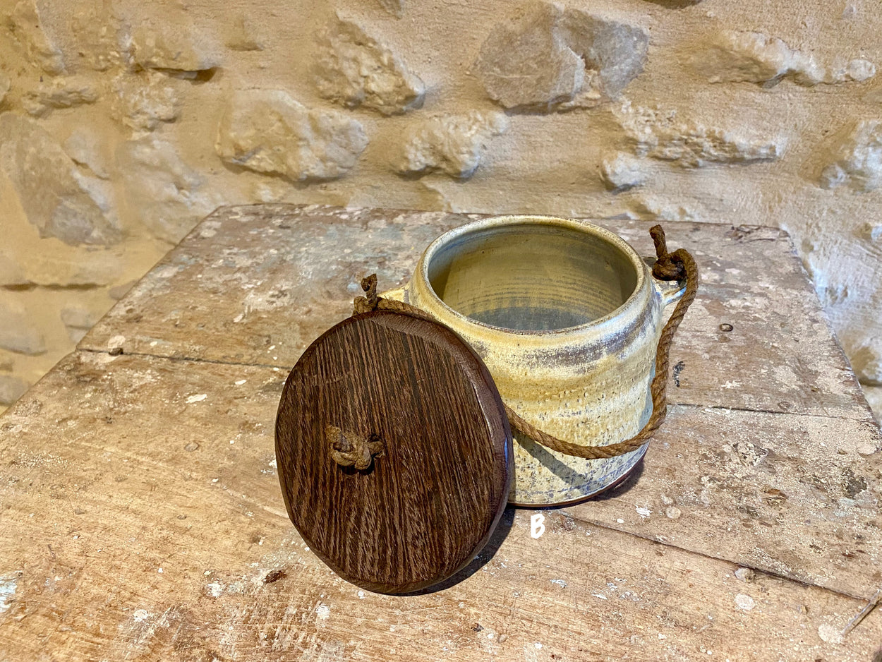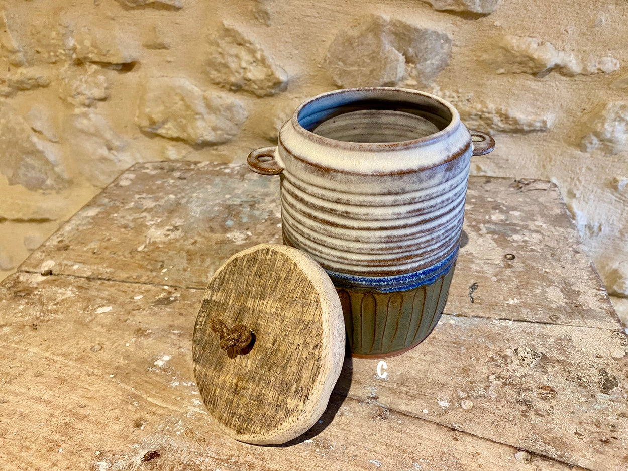 Lids are a great way to use up the smaller pieces of wood hanging around my workshop and make a great addition to some pieces such as these. Wheel thrown stoneware with a multi glaze finish, these will look right at home in any kitchen or on the shelf. The brown oak is the same wood used to make the lid and spoons for the sugar pots and is reclaimed from a thrown out dining table found on the streets of Paris.