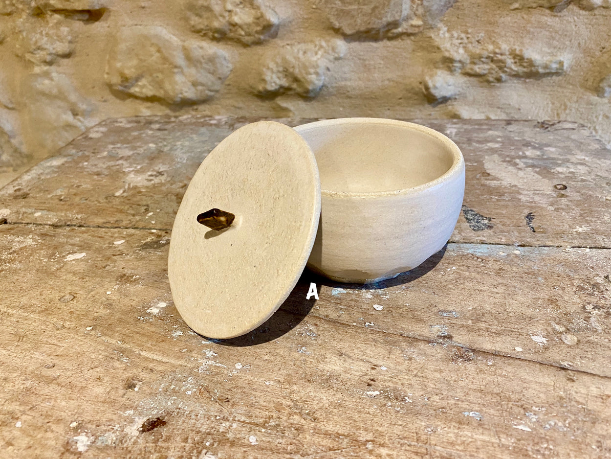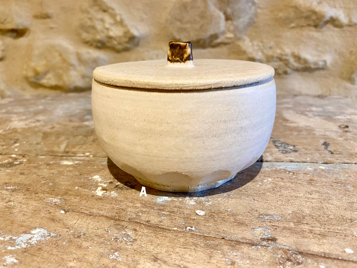 A (with ceramic lid) - 7cm H x 10.5cm W / 2.75" H x 4.15" W