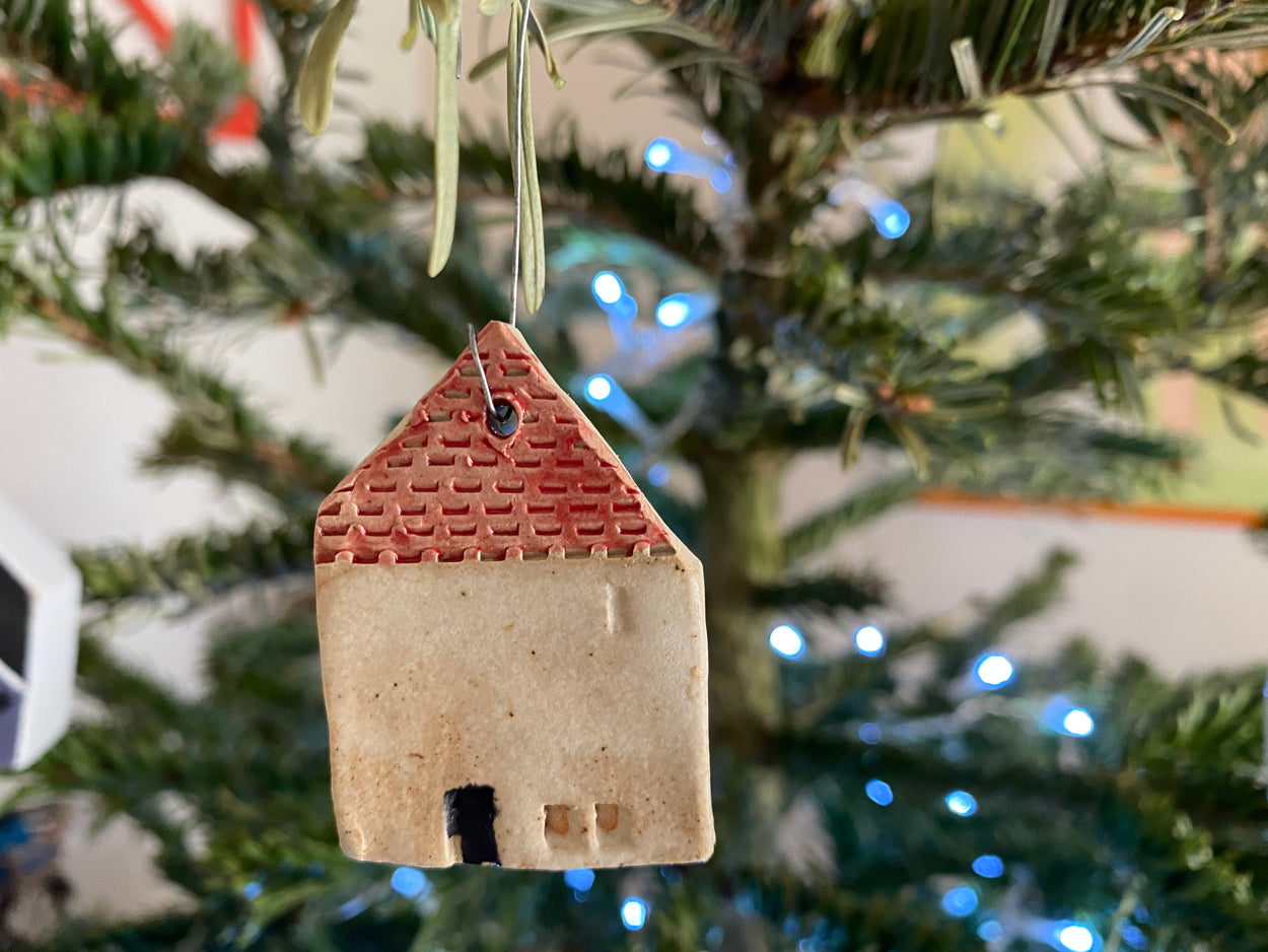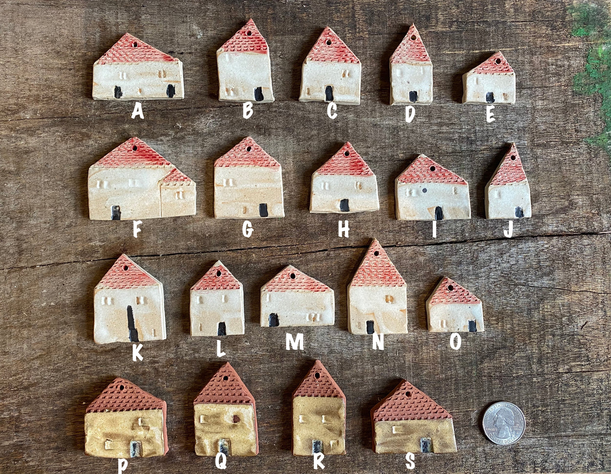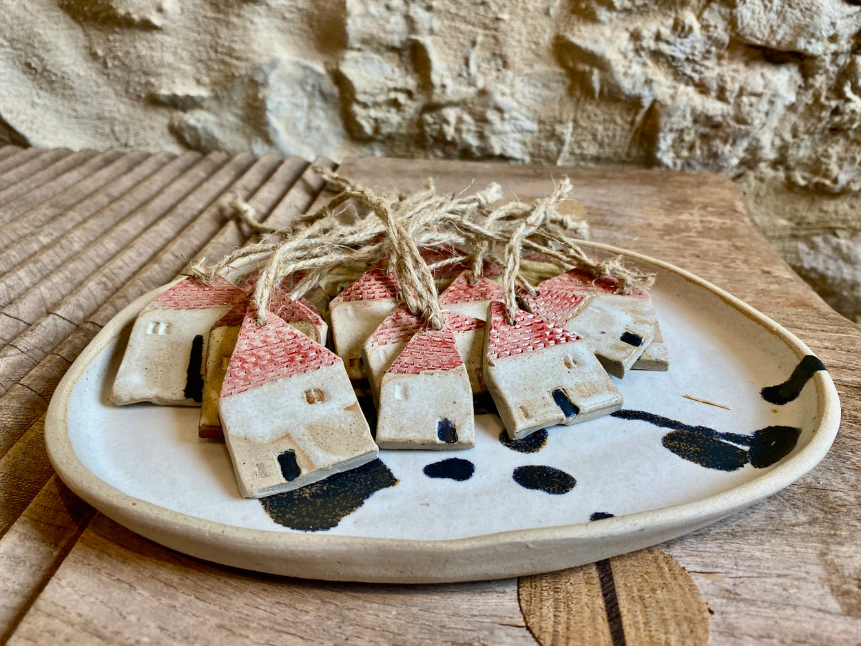 Inspired by the French farmhouses that surround us, stoneware clay was rolled out and cut by hand so each ornament is different much like the old farmhouses. Different clays and coloring techniques means the colors vary from house to house. Use the letter coded photo to choose the one that you can't live without.