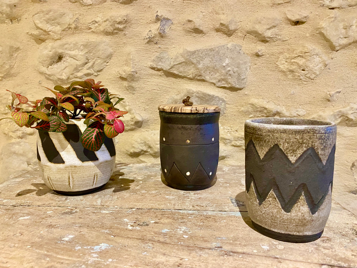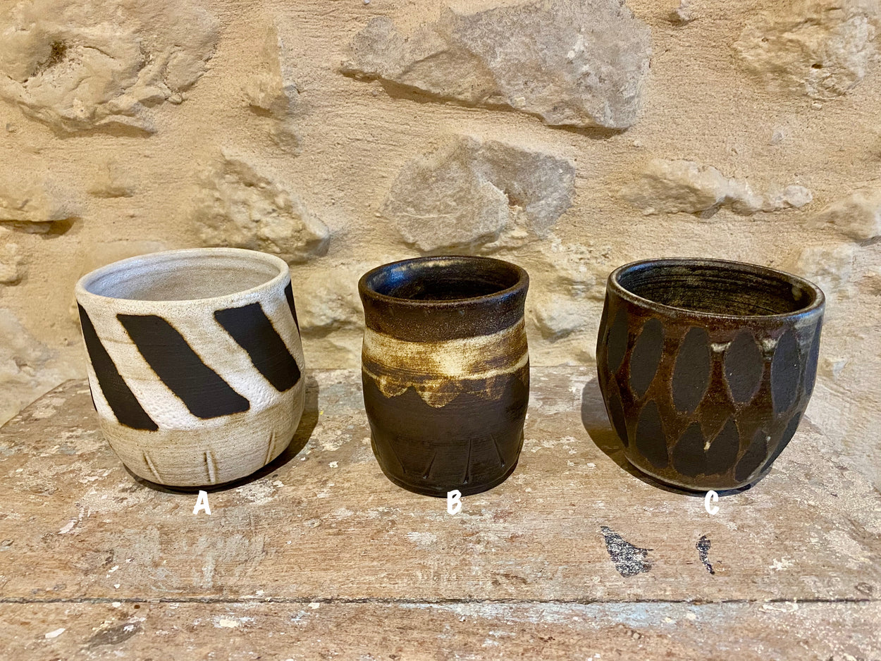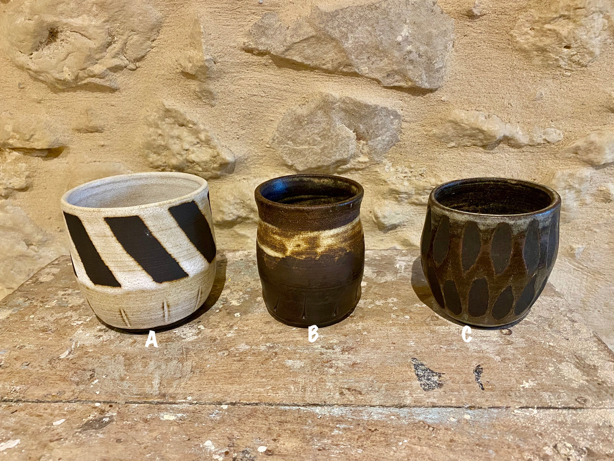A pot of many uses. Roughly the size of a large coffee mug but without handle these can serve as a large mug, planter, or with added lid a cool storage pot. The dark Africa stoneware clay gives these an aged look.
