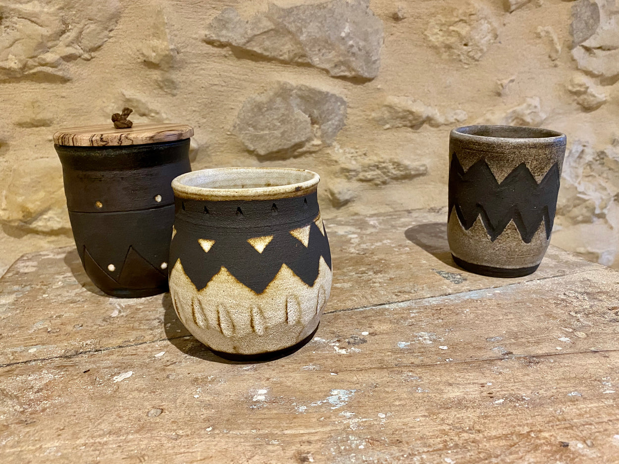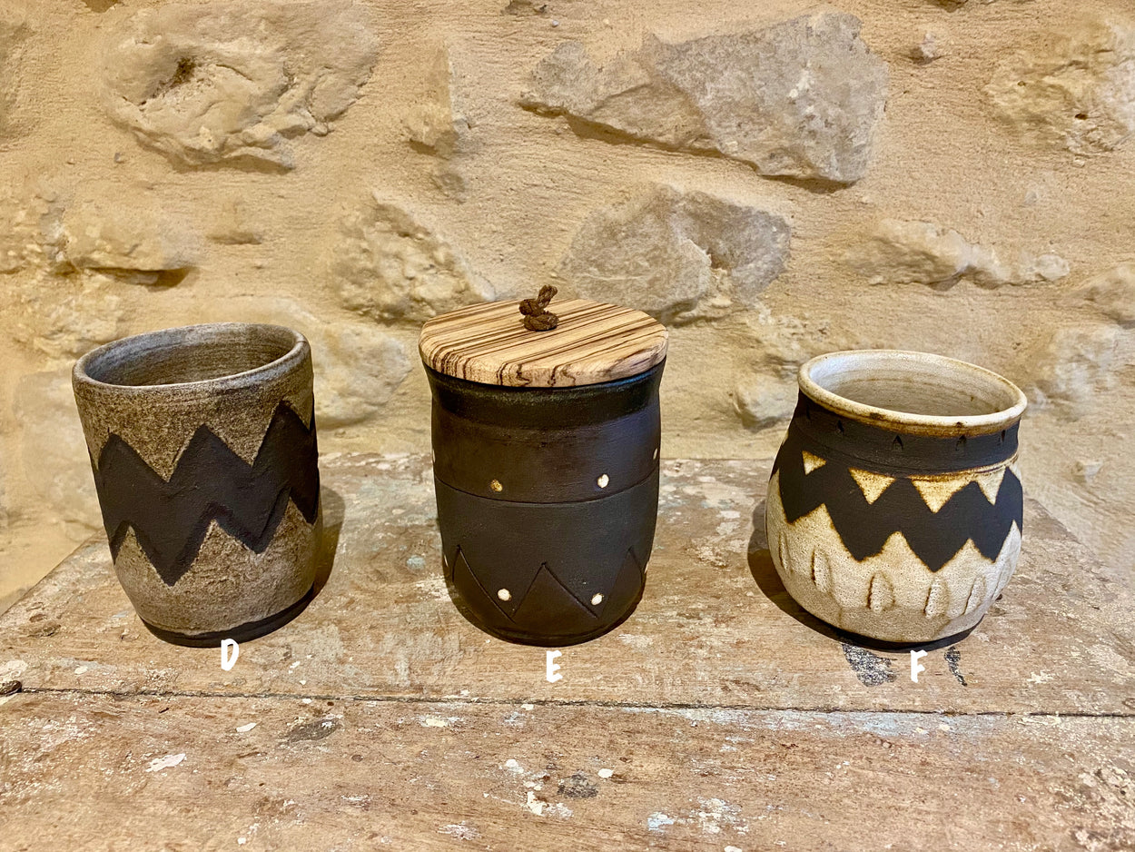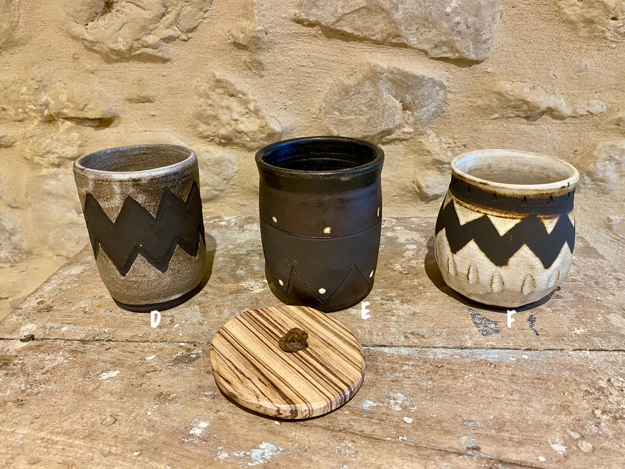 A pot of many uses. Roughly the size of a large coffee mug but without handle these can serve as a large mug, planter, or with added lid a cool storage pot. The dark Africa stoneware clay gives these an aged look.